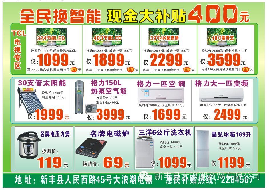 旧家电变废为宝,机不可失,更多优惠请到新丰县人民西路45号大浪潮电器咨询办理,惠民补贴热线:2284567