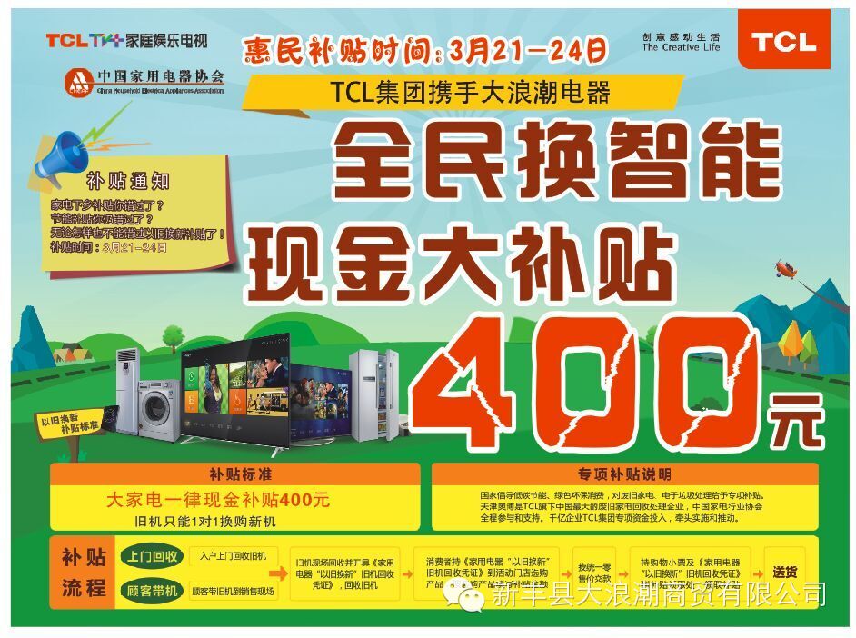 3月21—24日,凡在新丰县大浪潮电器购买TCL电视空调冰箱洗衣机,一律现金补贴400元,小家电享受超低换购价。